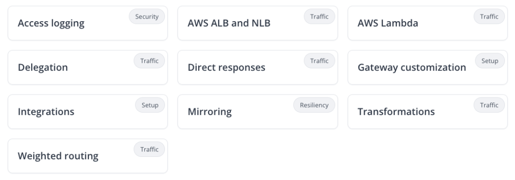 在Kubernetes Gateway API的基础上,Kgateway提供了以下扩展,用于配置高级的路由、安全性与可用性(弹性)能力。