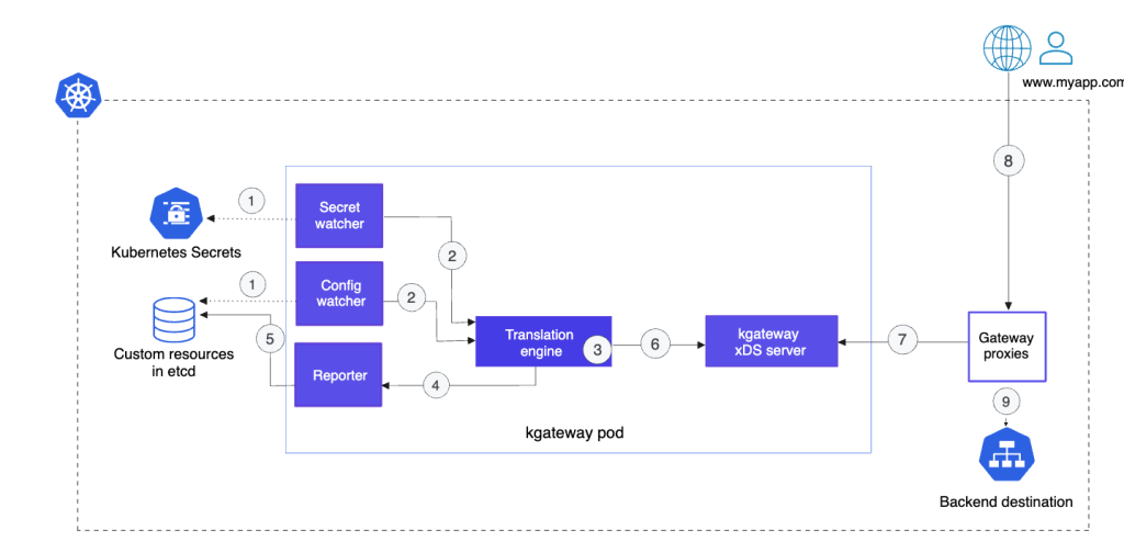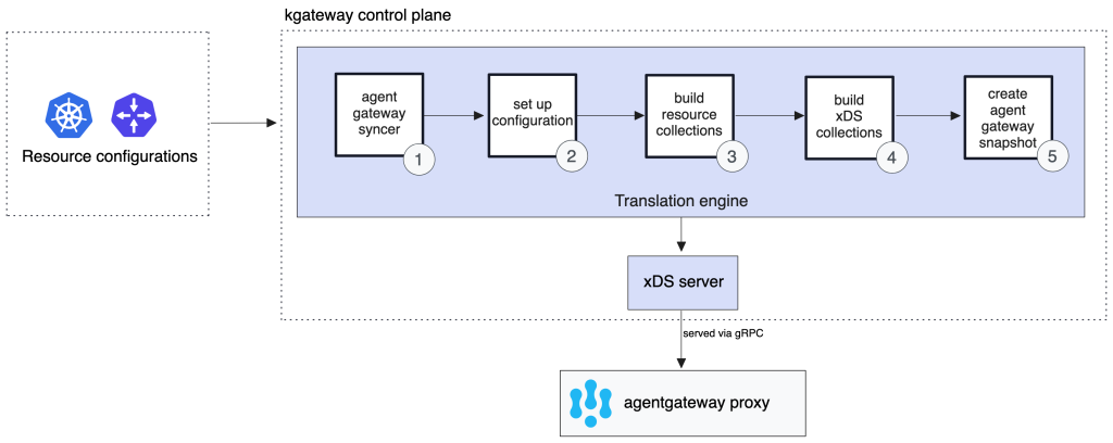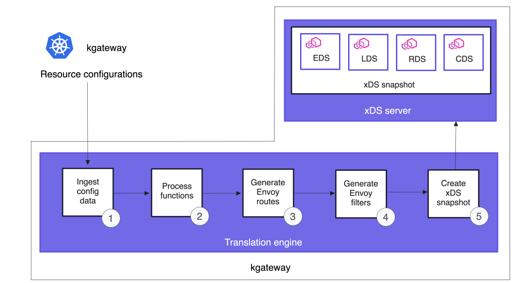 - 当配置或密钥watcher检测到新的或被更新的资源时,它会将这些资源的配置信息发送给 kgateway 的翻译引擎(translation engine)。